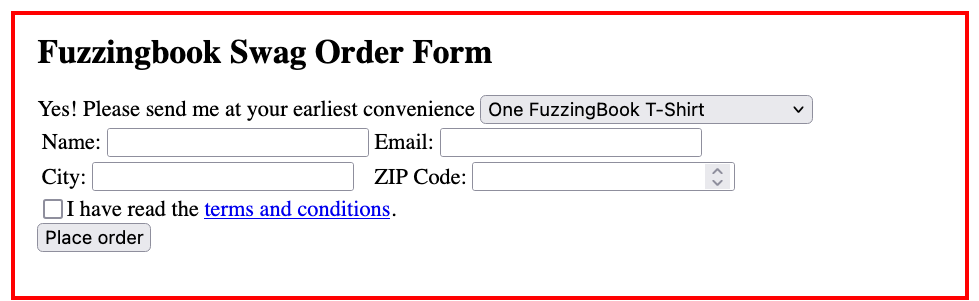 The GUI Fuzzer fuzz() method produces sequences of interactions that follow paths through the finite state machine. Since GUICoverageFuzzer is derived from CoverageFuzzer (see the chapter on coverage-based grammar fuzzing), it automatically covers (a) as many transitions between states as well as (b) as many form elements as possible. In our case, the first set of actions explores the transition via the "order form" link; the second set then goes until the "